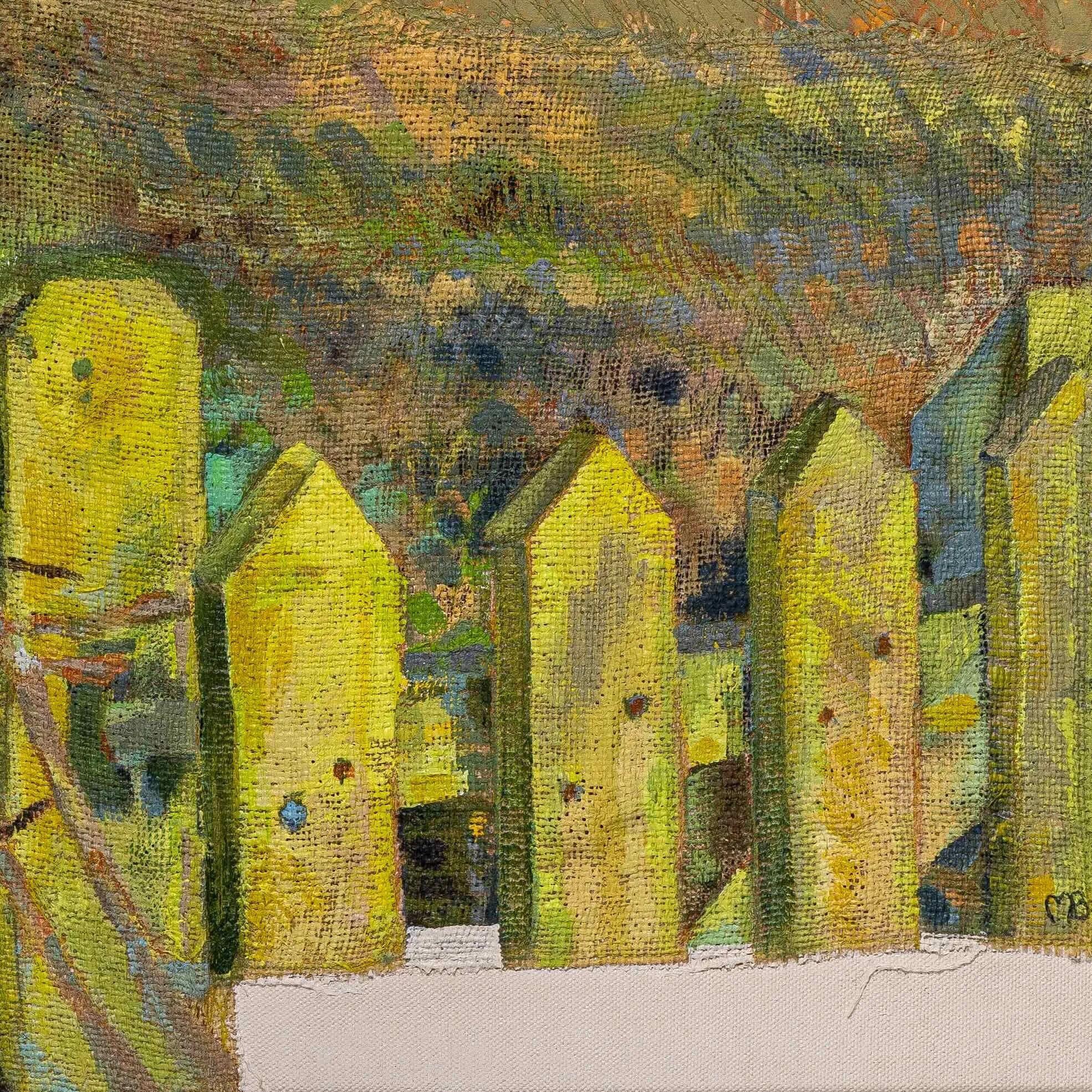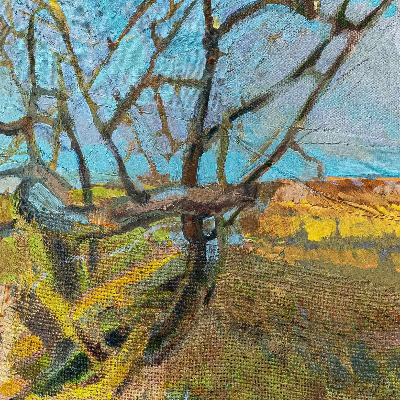The day this painting is based on, the early morning sun was particularly strong and clear, casting a hyper-real glow—a golden, dewy promise.