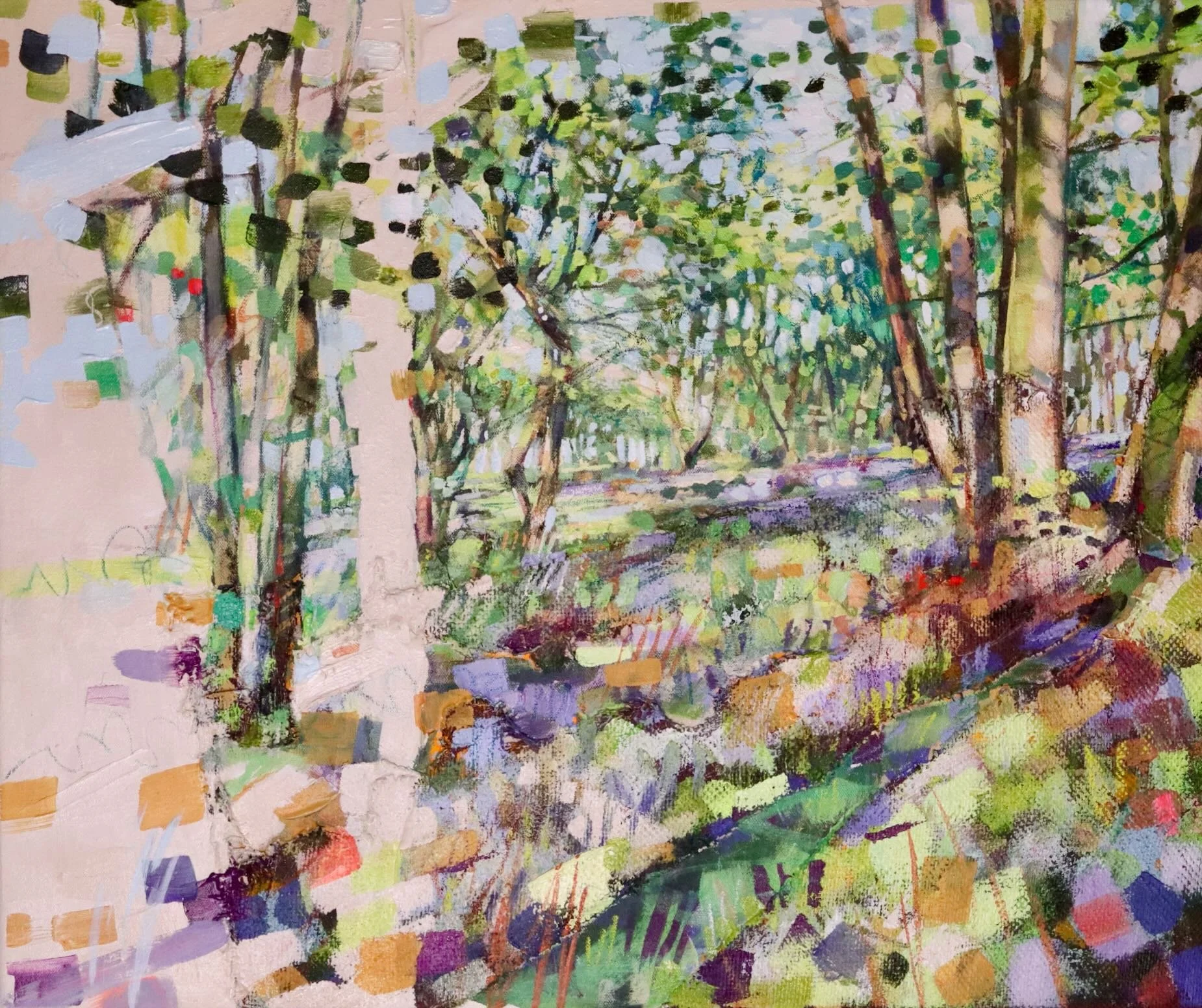 There is a sense of lung-expanding pride that comes with the privilege of inhabiting a beautiful landscape. The small woodland that provided the subject for this painting is just such a space. “Proud-pied April” appears as a phrase in Shakespeare’s Sonnet 98 and strikes me as a wonderfully vivid alliterative summation of a sense of communal attachment—a passing nod that says, “We are so lucky to live here.”
